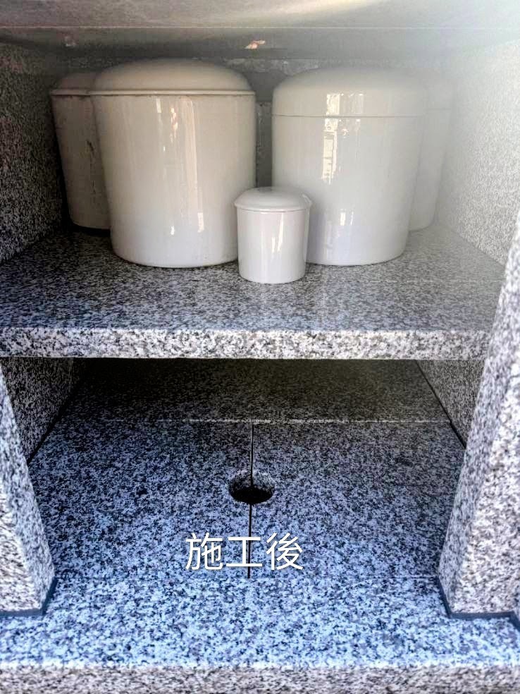 施工後は御影石のカロートを建て、排水口・換気口を設置。また骨壺は棚石の上に置くことで清潔な状態を保てる構造になりました。