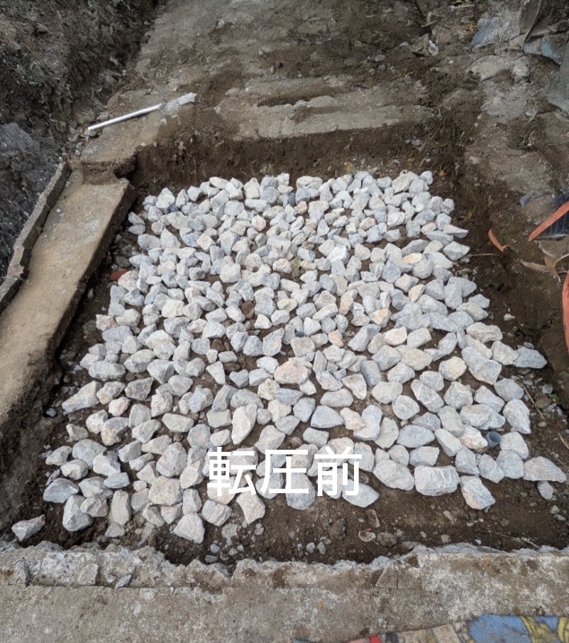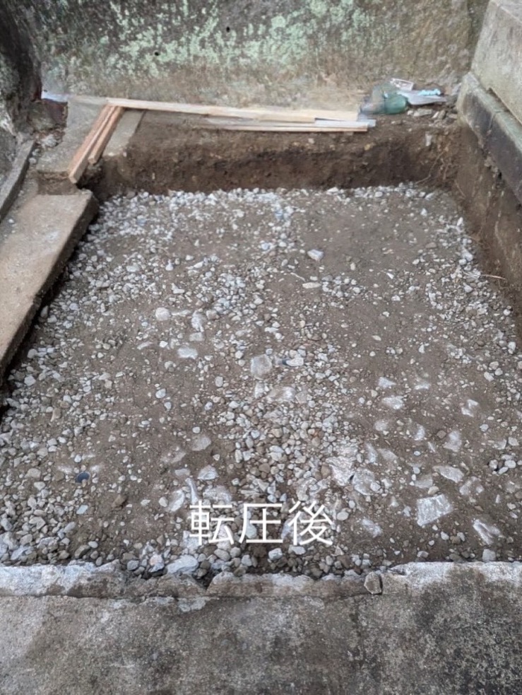 既存の地盤を確認したうえで掘削し、砕石を敷き均して十分に転圧。不同沈下を防ぐため、基礎位置には鋼管杭を打設し、長期的な安定性を確保しています。その上で基礎工事を行い、重い石塔や外柵をしっかり支えられる土台作りを行っております。