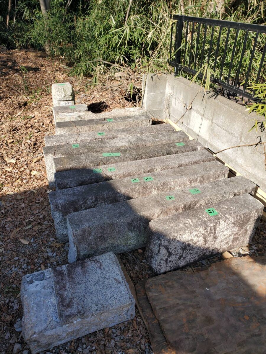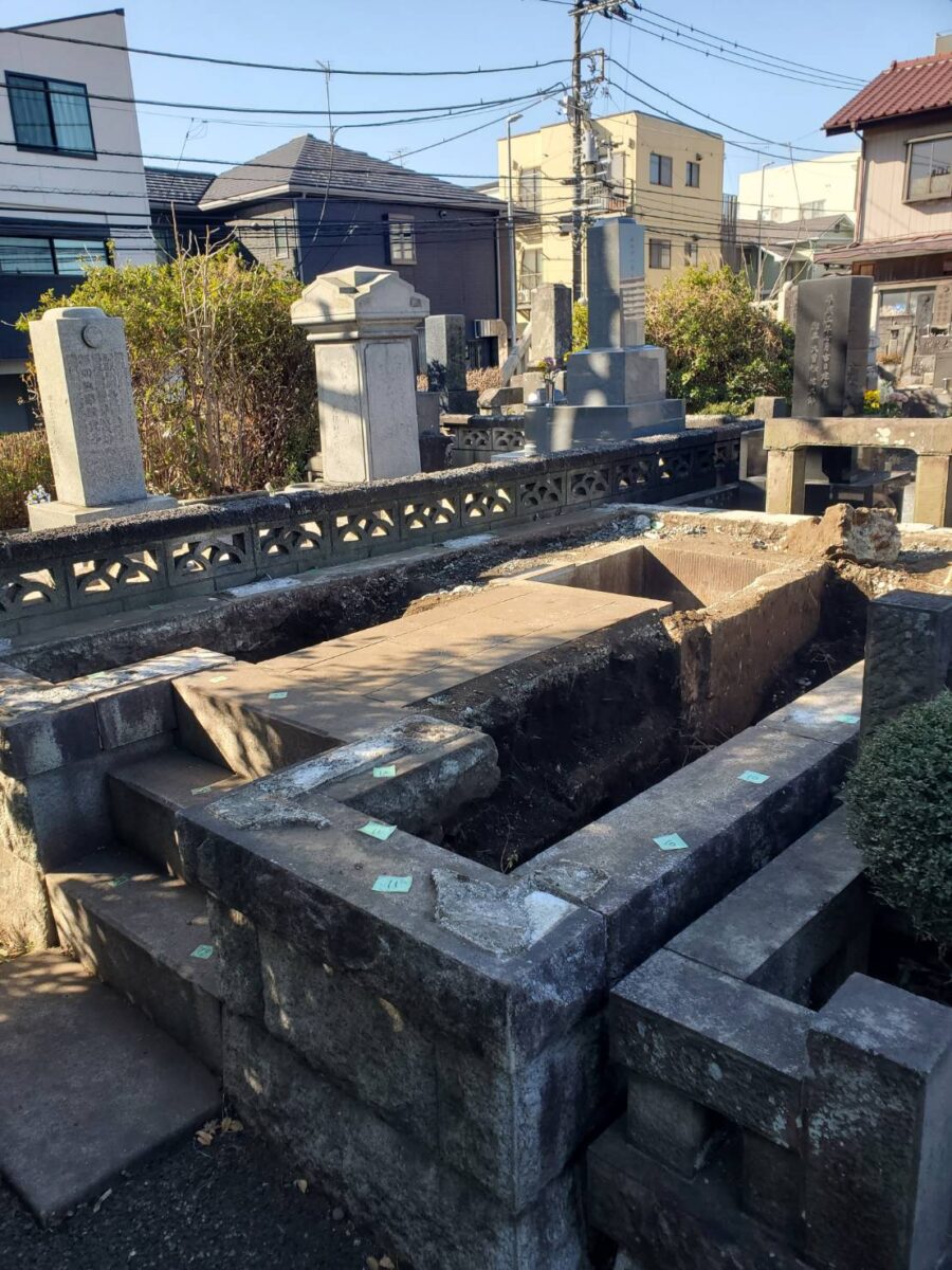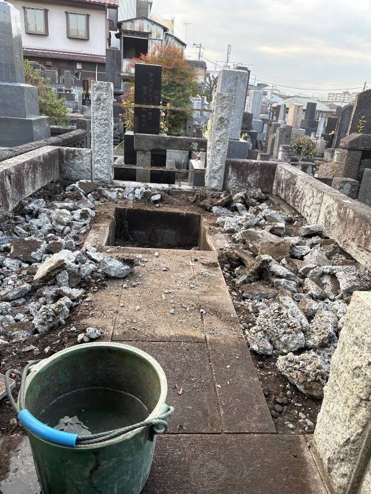 本日の現場は横浜にある寺院様で、墓所リフォーム工事です。墓所を更地にしてから強固な基礎を打設、再利用する墓石と外柵(墓所を囲う石材)を設置していきます。石材を再利用する際は石を欠けさせずに無傷で取り外しを行わなければなりません。ノミ入れの位置や角度、取り外し箇所の順番など石材の特性を把握していなければなりません。取り外すことを想定していないで作っている墓所を破損させずに無傷で解体するのは石工職人にとって一番難しい技術だと思います。弊社の工事スタッフは着工前の打ち合わせを入念に行い、様々な工事に日々対応しております。ご依頼いただいたお客様のご先祖様に馳せる思いを胸に…
