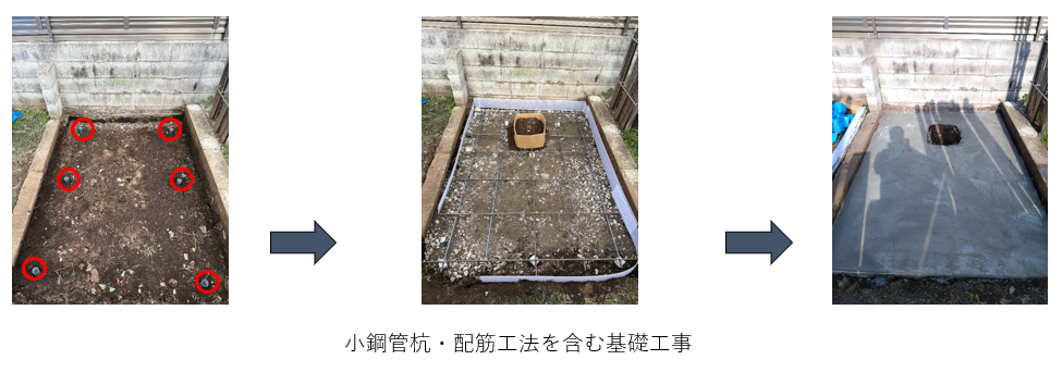 今回の工事においても、表層地盤改良工事(小鋼管杭工法を標準化)から始め、配筋施工・生コン打設を行いました。